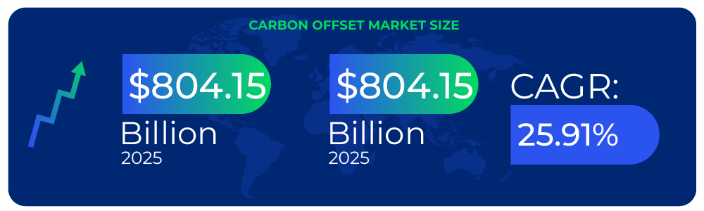 The carbon trading market currently stands at an estimated size of 595.8 billion USD and is projected to reach 804.15 billion USD toward the end of this year. The carbon offset market today is considered to be in its infancy with potential for rapid growth in the coming years.